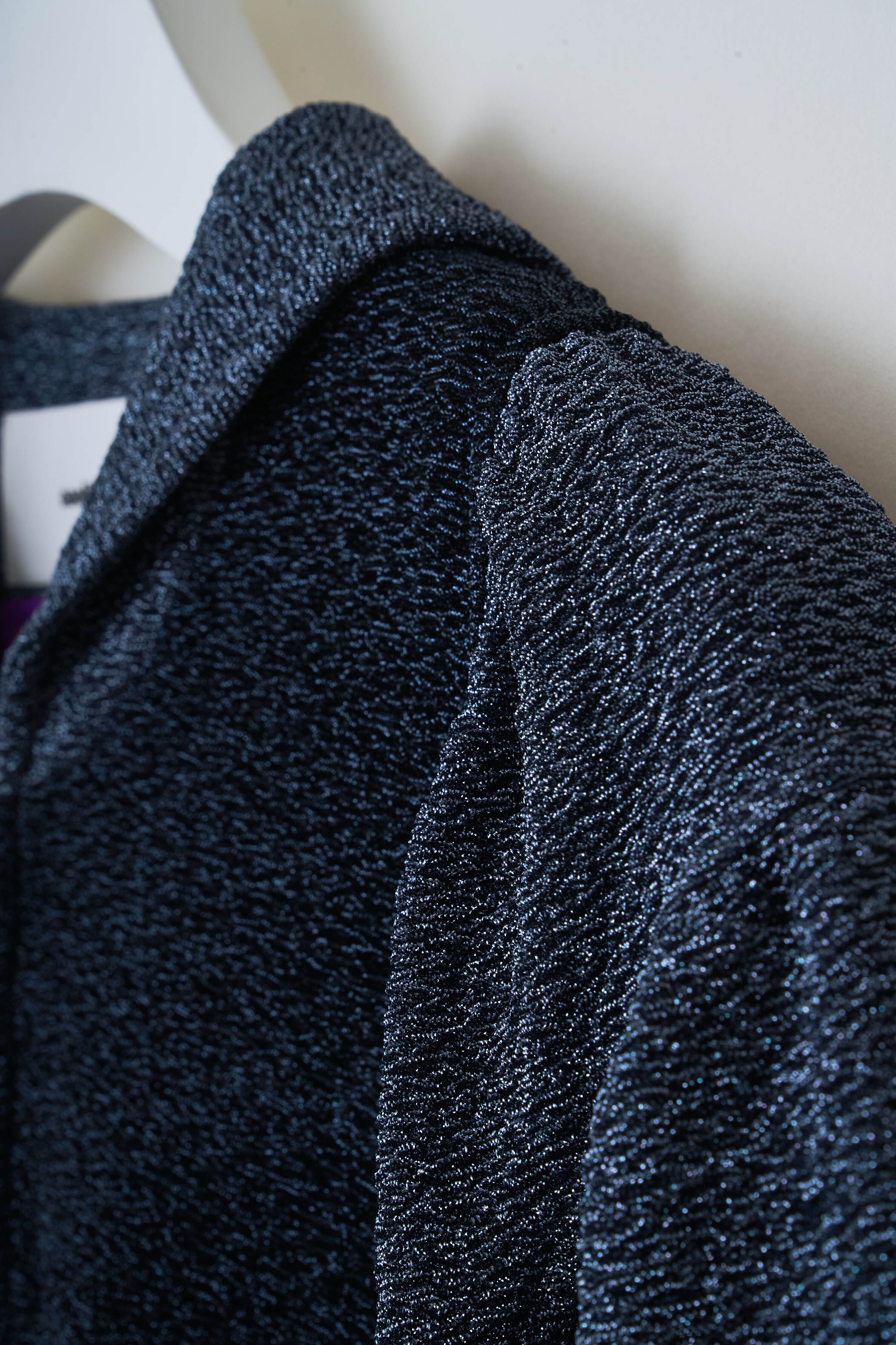 胸元にはエヴァンゲリオンの刺繍が施され、キラキラと輝く生地が存在感を引き立てる一着に仕上がっています。