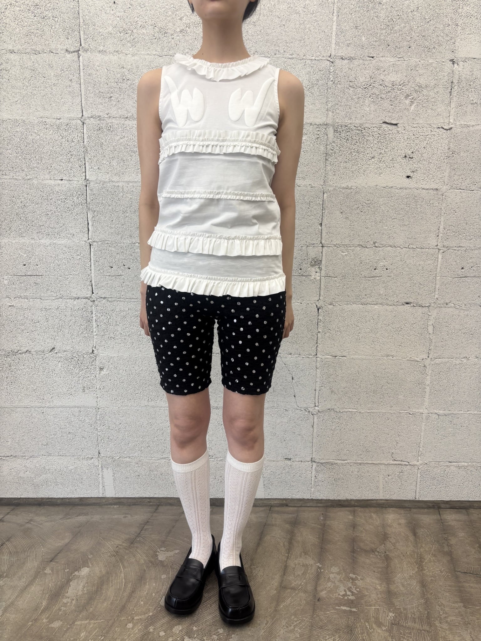 ワイルドシングスコラボになります。Wの発泡プリントを胸にあしらった今回の特別なデザインになります。ブランドの特徴でもある甘いディテールのフリルとワイルドシングスのカジュアル感が融合しております。