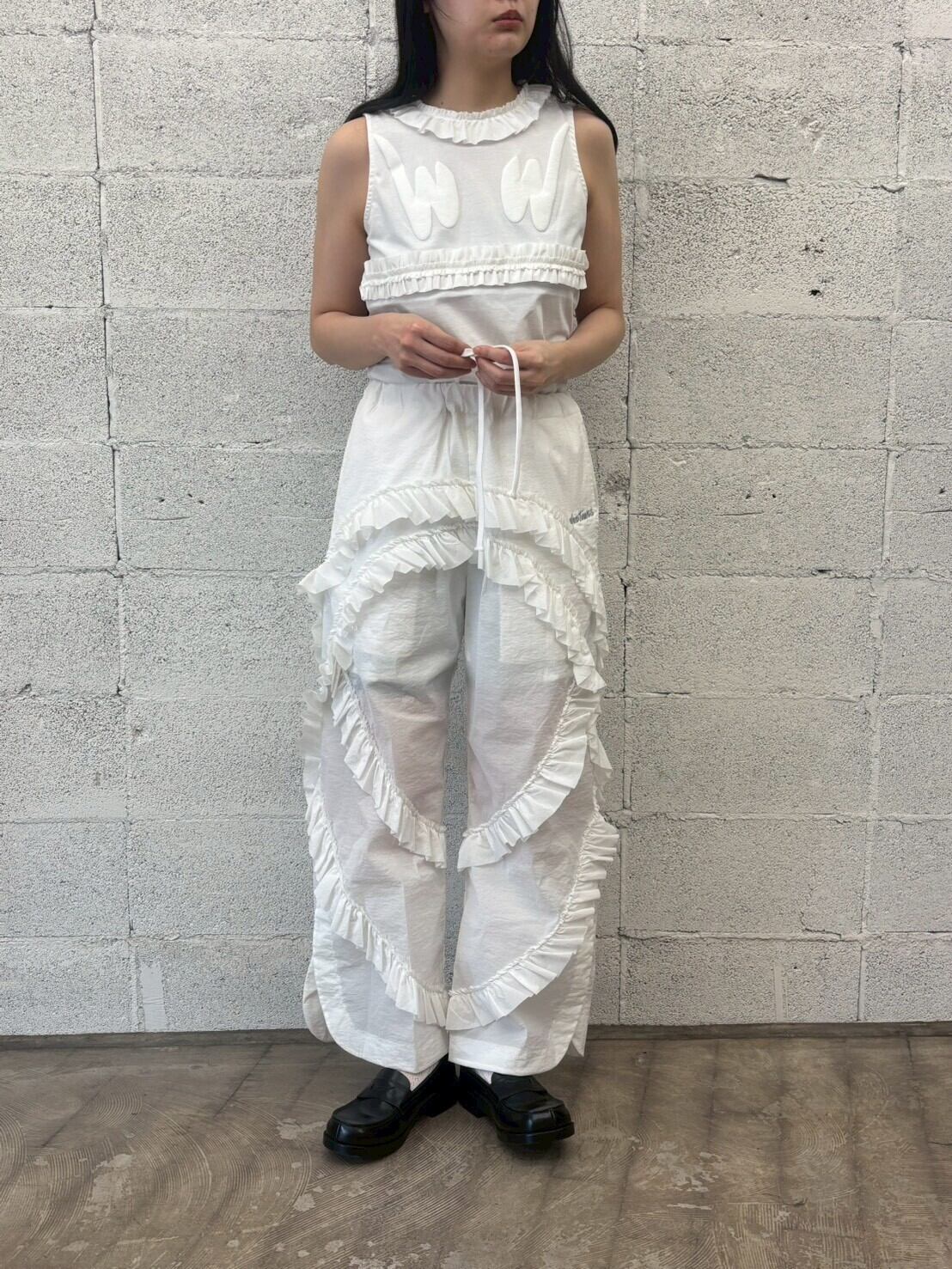 フリルデザインが特徴的なパンツです。フリルの付ける位置が特徴的で甘くなりすぎないのもポイントになっております。ワイルドシングスとのコラボ商品になります。