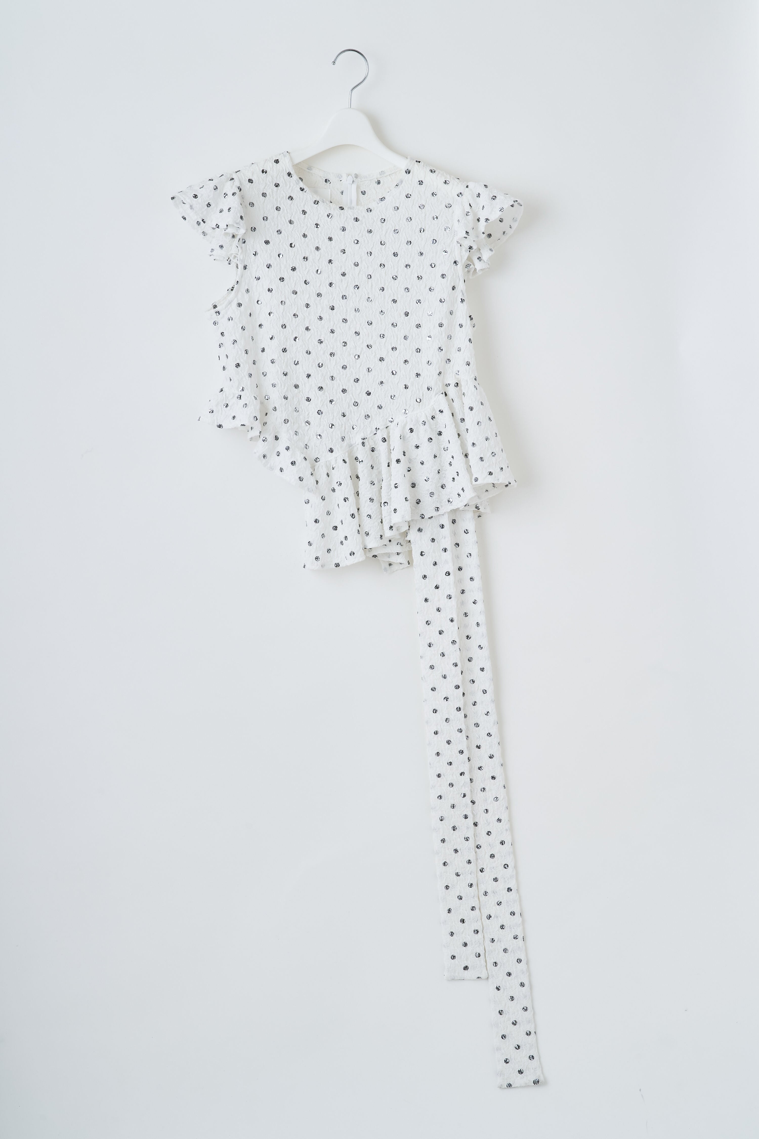 水玉箔プリントの生地を採用しております。アシメトリーなデザインとウエストでリボン結び出来るところも特徴になっております。