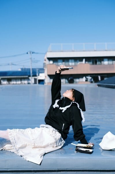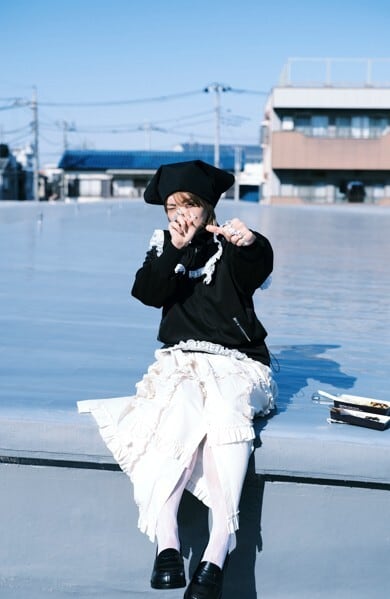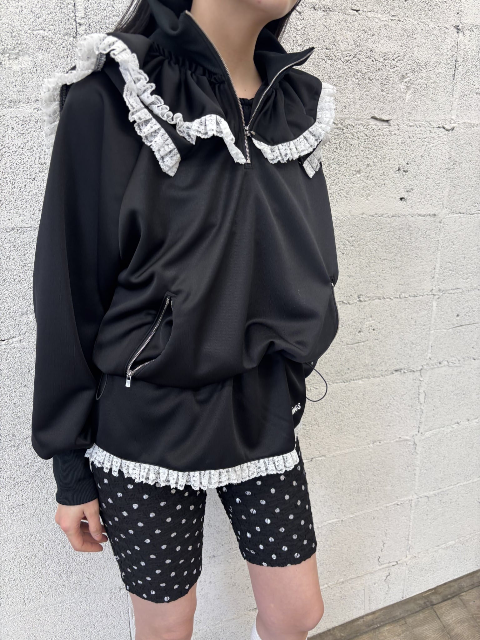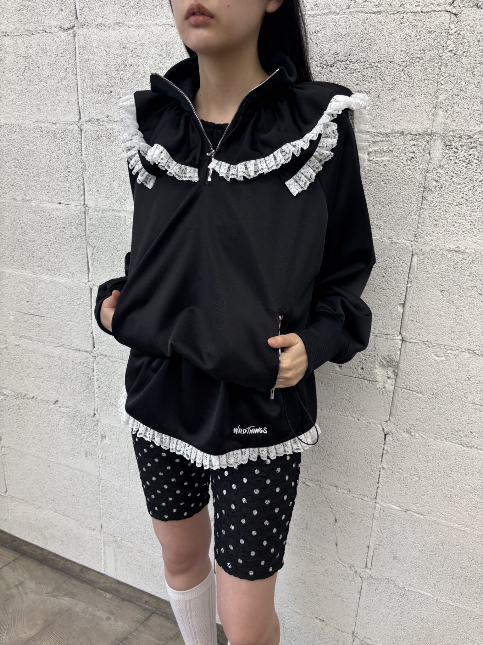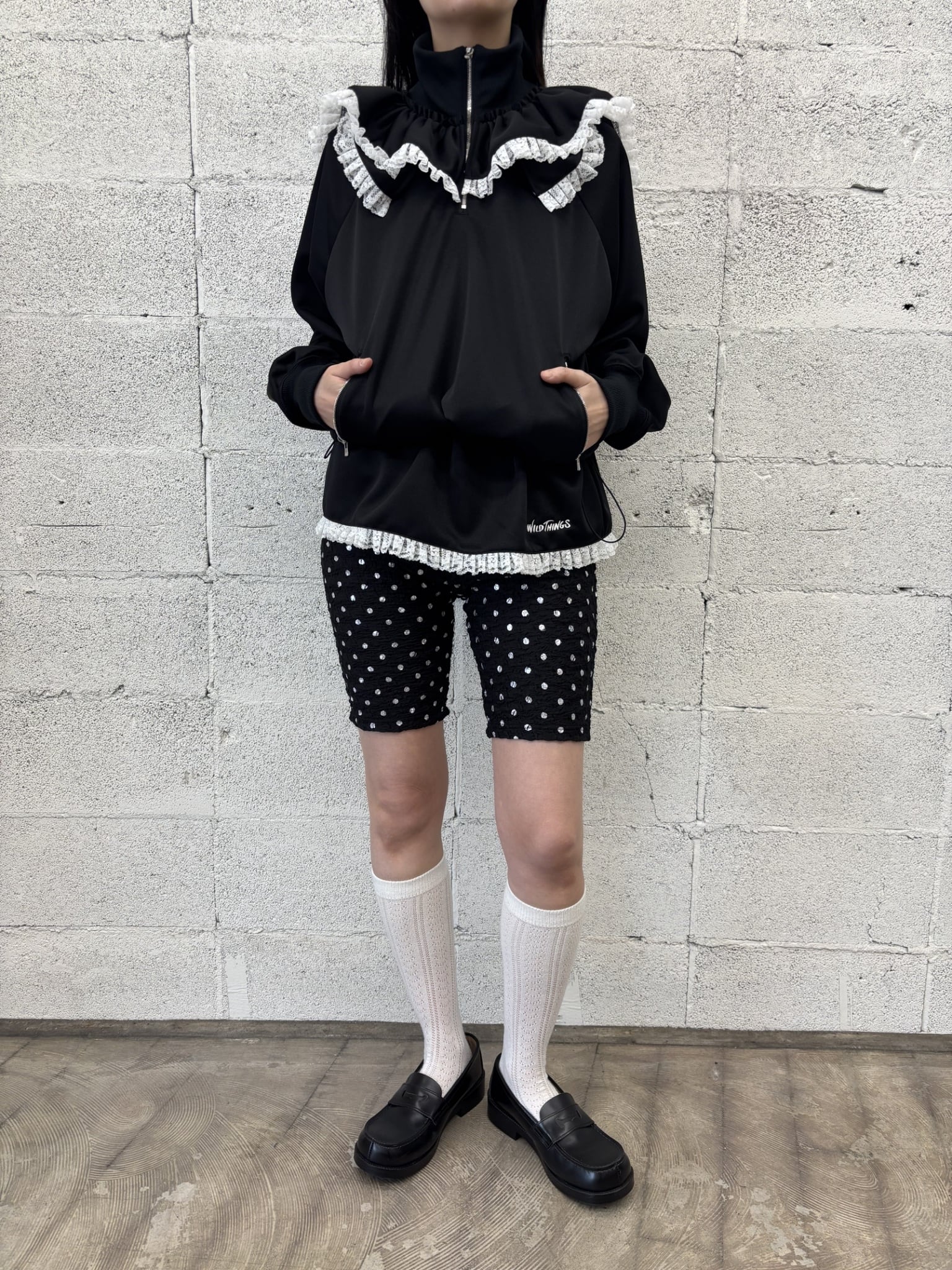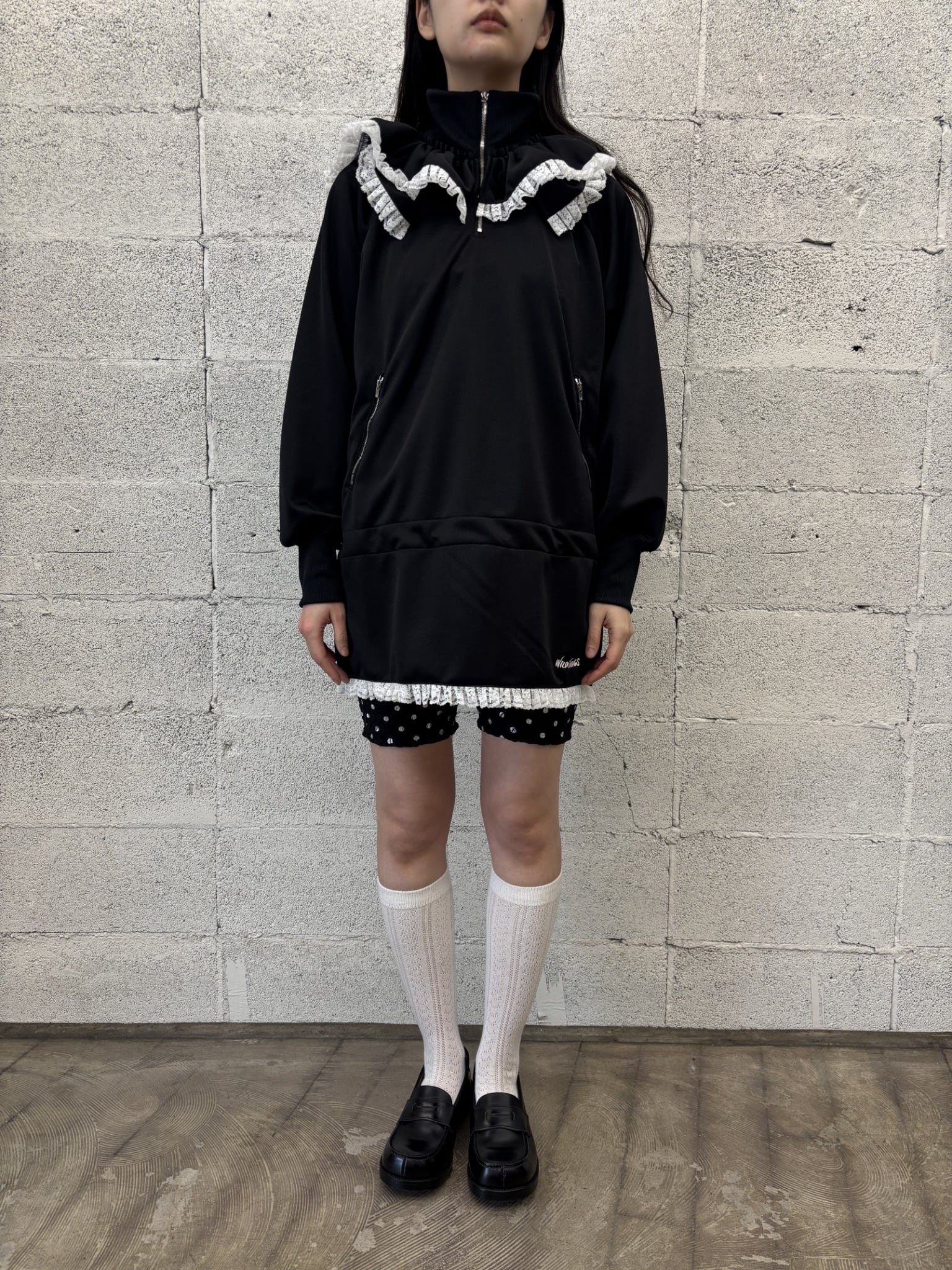 ワイルドシングスのコラボになります。ジャージー素材に変形セーラーのフリルが特徴的になっております。ウエストにはドローコードが入っていてシルエットを変えれることができます。